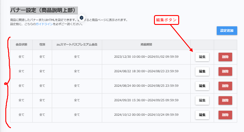 「バナー設定(商品説明上部)」のリストで編集したい項目を選ぶ(イベントが同種のものやレイアウトが似ているものなどで)