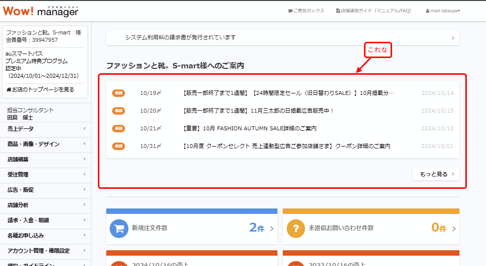 WOWmanagerトップ > FAQ・Salon・問い合わせ > auPAYマーケットSalon の画面へ