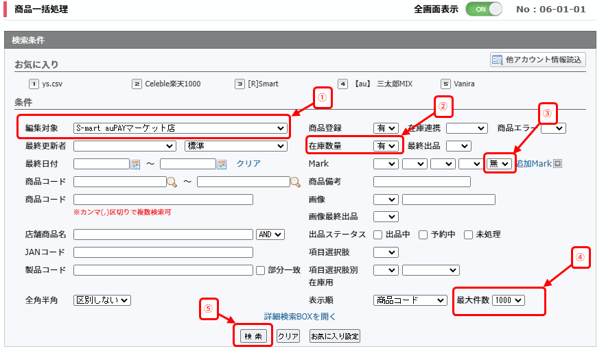2. スクショでは総件数4064件です。CMの仕様上1000件ずつしか表示できないので、件数分「次商品へ」を押して1000件ずつDLしてください。