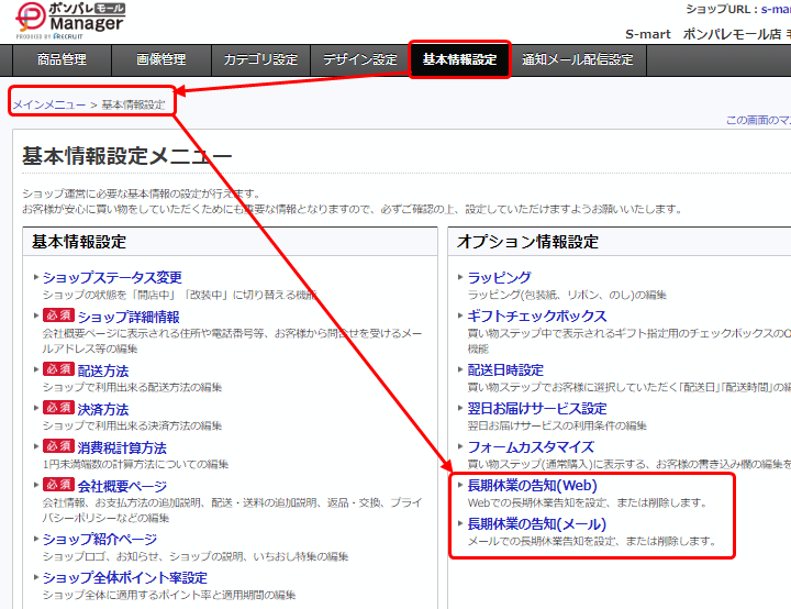 メインメニュー → ショップ管理 → 基本情報設定 → 長期休暇告知(Web)の設定、長期休暇の告知(メール)の設定