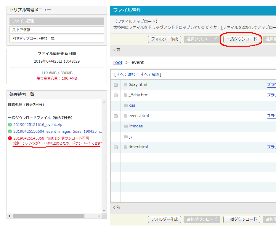 DLするファイル数が1000件以上あるとDLできないので注意。