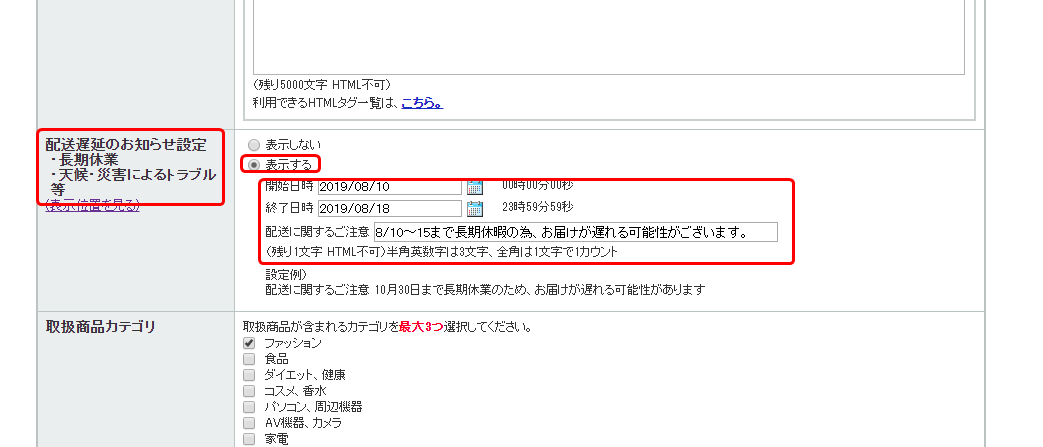 「日時指定についての説明文」に下記文言を追加