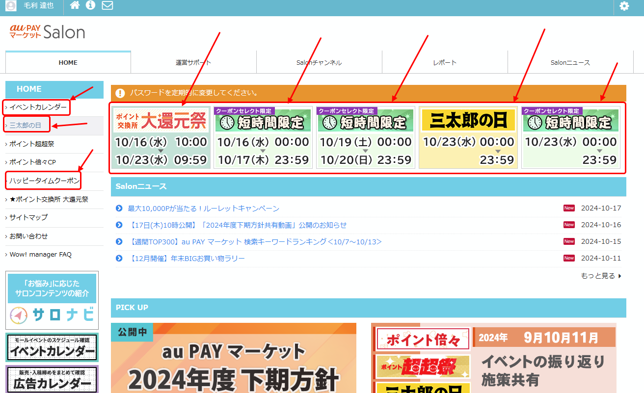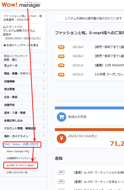 WOWmanagerトップ > FAQ・Salon・問い合わせ > auPAYマーケットSalon の画面へ