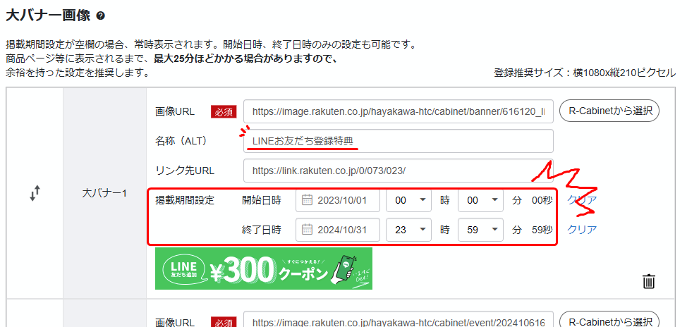 【3】 大バナー設定 / LINEお友達登録特典バナーの掲載期間を該当の月に変更する
