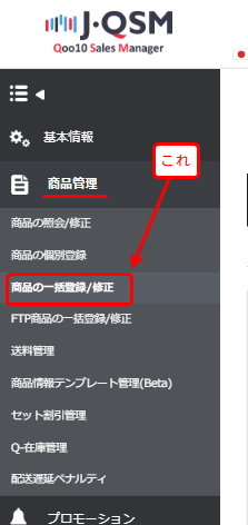 +[[商品管理>一括データ管理>https://qsmupload.qoo10.jp/GMKT.INC.Gsm.Web/DataLinkage/DataLinkageManagement.aspx]] を開く。
